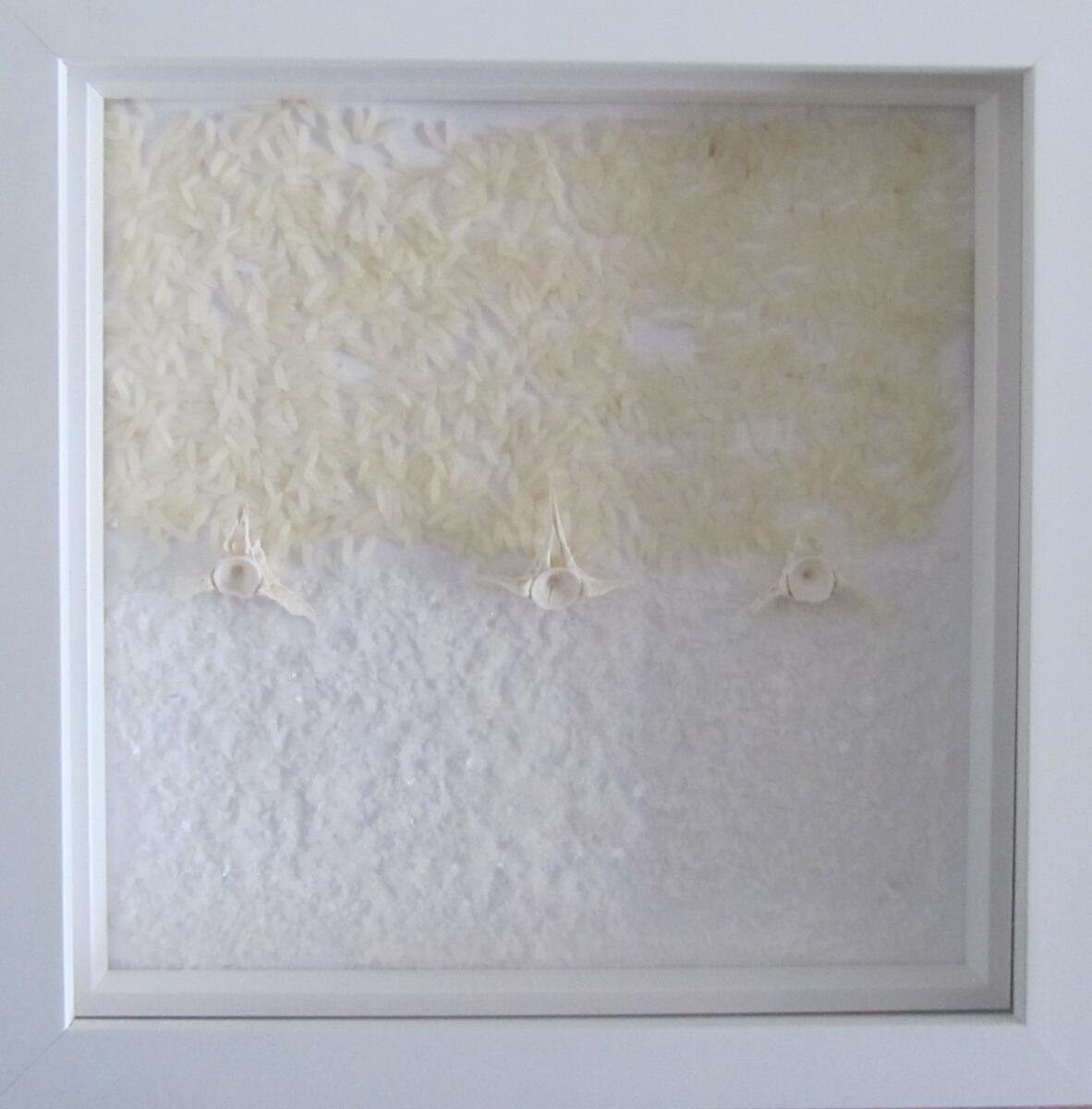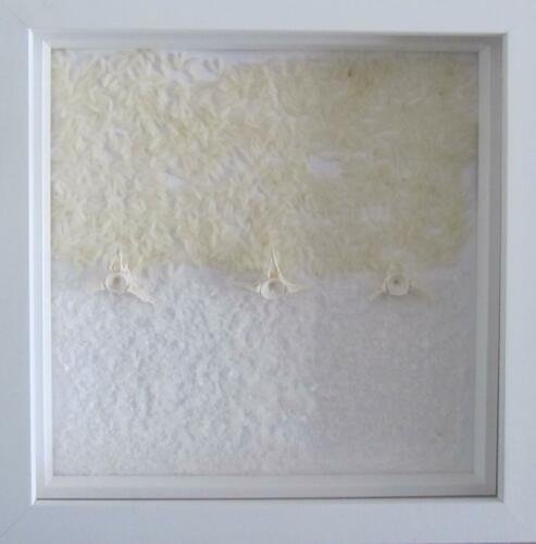 Ihre Objekte sind Lebensmittel bzw. Reste davon, die sie in einem auf – wendigen Verfahren getrocknet hat. Durch diesen Prozess verfremden sich die Lebensmittel, teils verändern sie ihr Aussehen bis zur Unkenntlichkeit, sie werden „dicht“.
